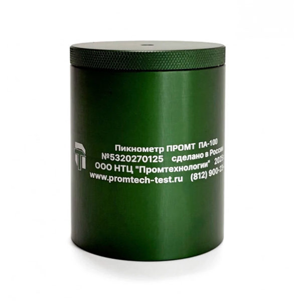 Пикнометр представляет собой цилиндрический алюминиевый стакан с плотно прилегающей крышкой из того же материала. В центре крышки имеется отверстие, а внутренняя поверхность слегка вогнутая. Такая конструкция обеспечивает стабильность измерений и точный объём исследуемой жидкости (100 ± 2 см³) при правильной эксплуатации.