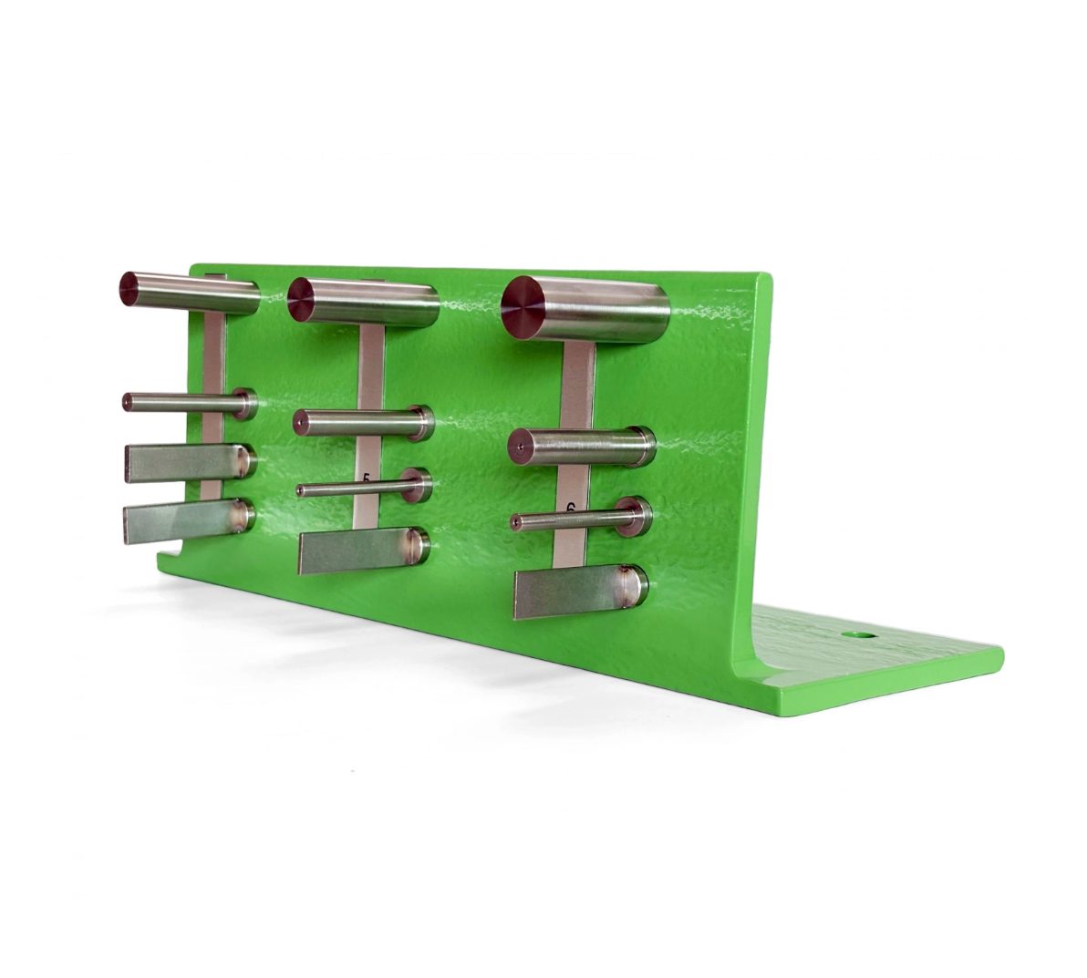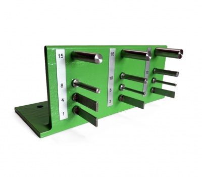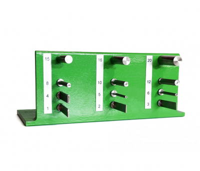 Прибор полностью соответствует ГОСТ Р 31974-2012, ГОСТ 6806-73 и ISO 1519-73. Массивное чугунное Г-образное основание имеет 12 отверстий, куда крепятся сменные металлические испытательные стержни и пластины. В стандартном исполнении их диаметр составляет 1 до 20 мм, дополнительно возможно заказать и установить на тестер стержни диаметром 25 – 55 мм. Большая часть из них выполнена в виде цилиндров, значение 1; 2; 3 и 4 мм имеют пластины соответствующей ширины с закругленной верхней кромкой.