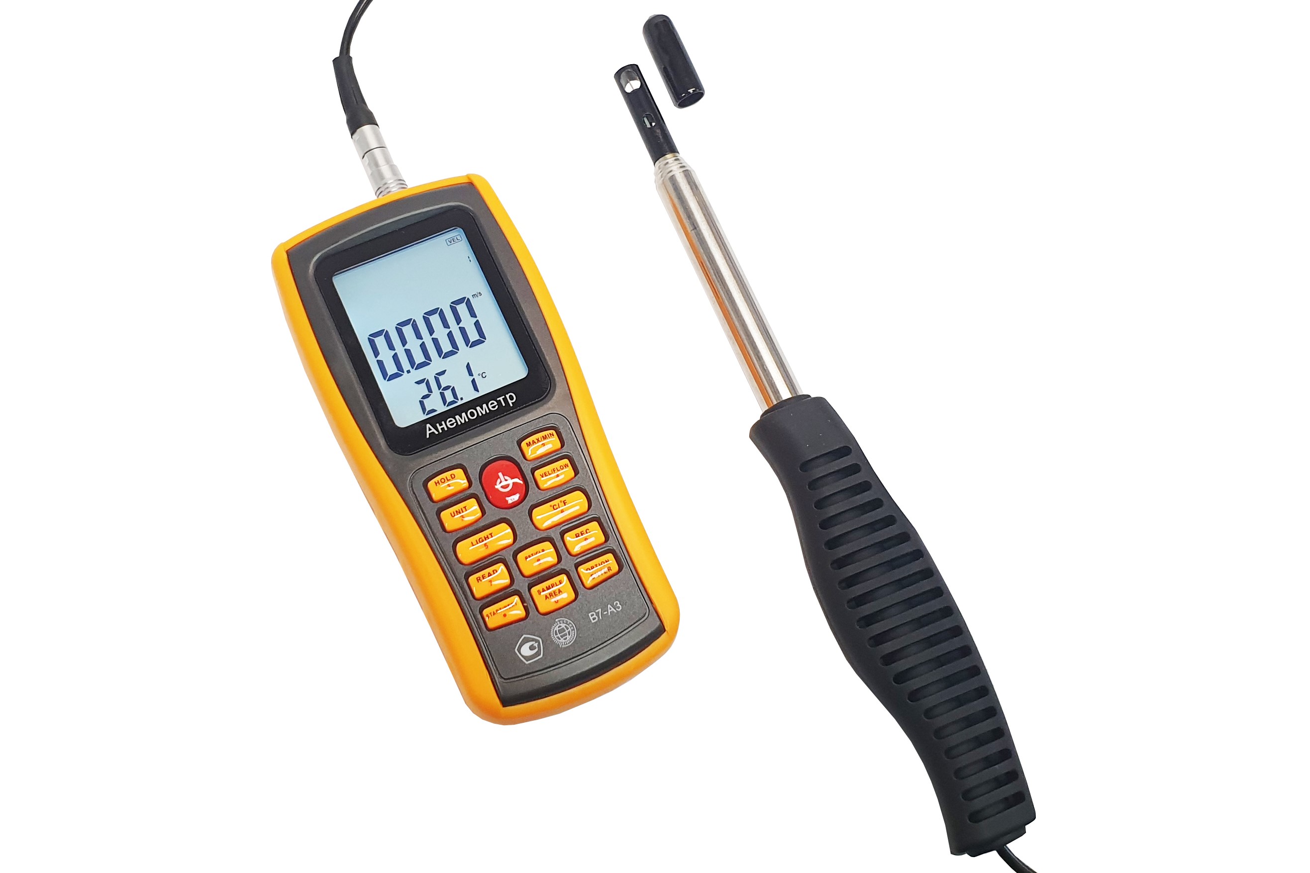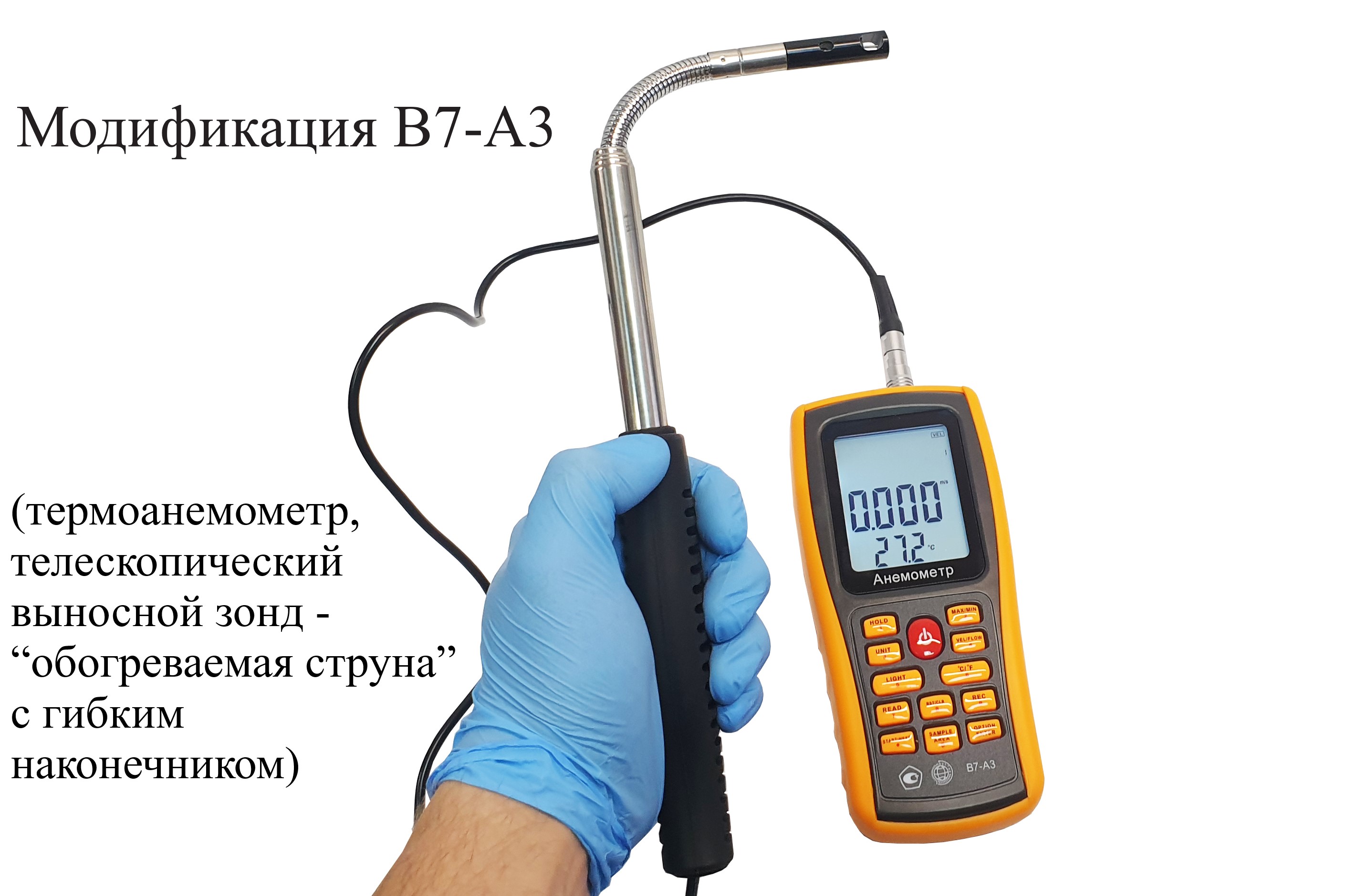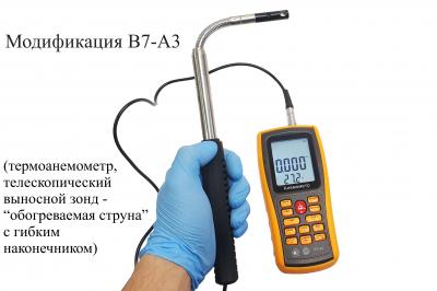 Модификация В7-А3 (термоанемометр, телескопический выносной зонд-“обогреваемая струна” с гибким наконечником) представляет собой мобильный многофункциональный микропроцессорный анемометр ручного формата. Он состоит из электронного блока с измерительным зондом выносного типа. Применяется для однократного и периодического измерения температуры и скорости направленного воздушного потока и других газов в вентиляционных каналах и системах кондиционирования с вычислением объёма расхода, средних, максимальных и минимальных параметров воздушного потока.