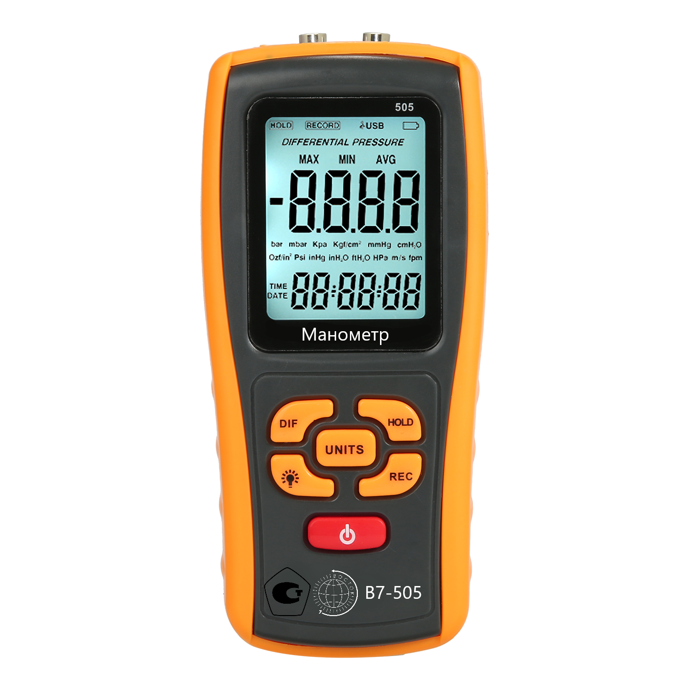 Манометры цифровые дифференциальные В7-505 предназначены для измерения разности (перепада) давлений жидкостей, газов и пара, а также для измерений величин, функционально связанных с давлением, например, для измерений уровня и плотности жидкостей, расхода жидкости, пара и газа. Основное назначение – измерение давления при ревизии, ремонтных работах, пусконаладке вентиляционных, климатических и нагревательных систем, в т. ч. для котельного оборудования/котлов отопления (бытовые и промышленные топливо сжигающие установки) при настройке тяги дымохода. Также частыми областями применения являются замеры давления в кровяной и дыхательной системах человека, отрицательного давления в пылезащитных (беспылевых камерах), определение ветрового давления (нагрузки).