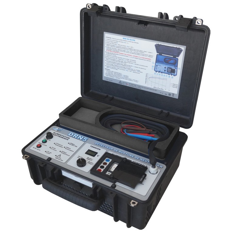 DRN5 легко подключается в любой точке доступа к низковольтной сети, находящейся под напряжением, с помощью зажимов типа «крокодил» и нагружает каждую фазу несбалансированной нагрузкой. Комплект автоматически измеряет 3 напряжения, алгебраическая сумма которых позволяет быстро обнаружить обрыв нейтрали, если это значение не равно нулю.
