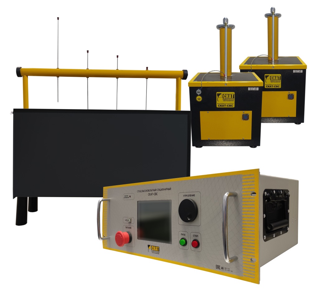 СКАТ-СВС предназначен для проведения приёмосдаточных и эксплуатационных электрических испытаний средств защиты (изоляционные штанги, резиновые боты, перчатки, электроинструмент и т.п.) переменным напряжением промышленной частоты, регулируемым в пределах от 0 до 100 кВ. Также оборудование стендов может использоваться для испытаний изоляции переменным током (кабелей, изоляторов).