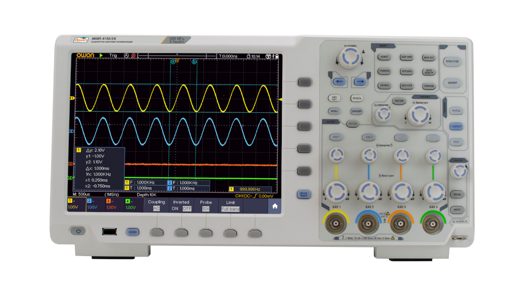 высокая скорость обновления экрана до 600.000 осц./сек. Интерполяция - sin x/х, линейная. Автоматические (до 40 параметров) и курсорные измерения. Математические функции, БПФ. Синхронизация и декодирование сигналов, UART/RS232, I2C, SPI, CAN. Встроенный генератор сигналов 50 МГц, мультиметр 4,5 разряда, частотомер 6 разрядов. |