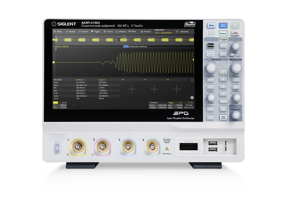 Осциллограф высокого разрешения, разрядность АЦП 12 бит. Высокая скорость обновления экрана до 500.000 осц./сек. Режим сегментированной памяти. Режим HISTORY. Интерполяция - Sin X/х, линейная. Автоматические (более 50-и параметров) и курсорные измерения. Математические функции, БПФ (2 МБ). Режим «Поисковая машина/ Search» для поиска событий по условиям заданным пользователем. Cинхронизация и декодирование сигналов, стандартно - I2C, SPI, UART/RS232, CAN, LIN, опционально - CAN FD, FlexRay, I2S, MIL-STD-1553B, SENT, Manchester. Опция - логический анализатор 16 каналов. Опция - функциональный генератор до 25 МГц. Опция - измерение мощности и показателей качества электроэнергии (ПКЭ). Программные опции для увеличения полосы пропускания. | Интерфейс