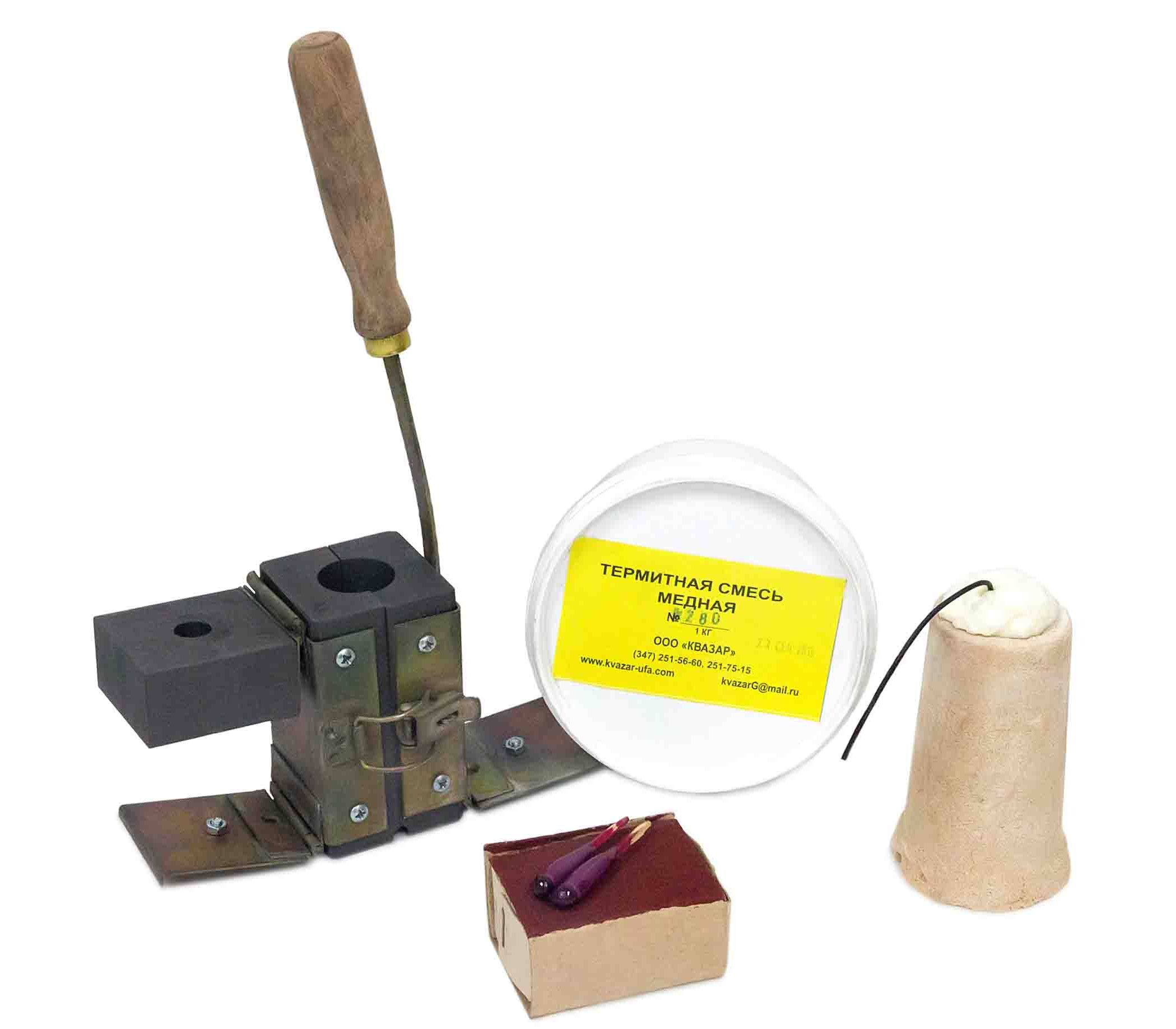 Комплект включает в себя: термитную смесь, одноразовую и многоразовую тигель-форму, термопатроны и термошашки, очки сварщика, лупу с подсветкой, плоскогубцы, тонкогубцы, гаечный ключ, отвертки, шаблоны сварщика, металлическую линейку, напильники плоские, слесарный молоток, горелку с рукавом, плавкий пруток, зубило омедненное.