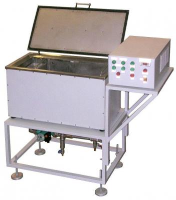 Установка состоит из ультразвуковой ванны в термо- и звукоизолирующем корпусе, системы рециркуляции моющего раствора, блока управления и подставки.
