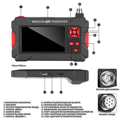 Мегеон 33600 - это цифровой видеоскоп с полужестким зондом длиной 5 м и вращающимся блоком камер, управляемым с панели. Он оснащен двумя видеокамерами высокого разрешения и светодиодной подсветкой с регулировкой яркости для работы темных помещениях. Встроенная аккумуляторная батарея позволяет прибору работать в автономном режиме. Цветной ЖК дисплей диагональю 4,3 дюйма. Оснащён функцией сохранения фотографий и записи видео в режиме реального времени на карту памяти microSD.