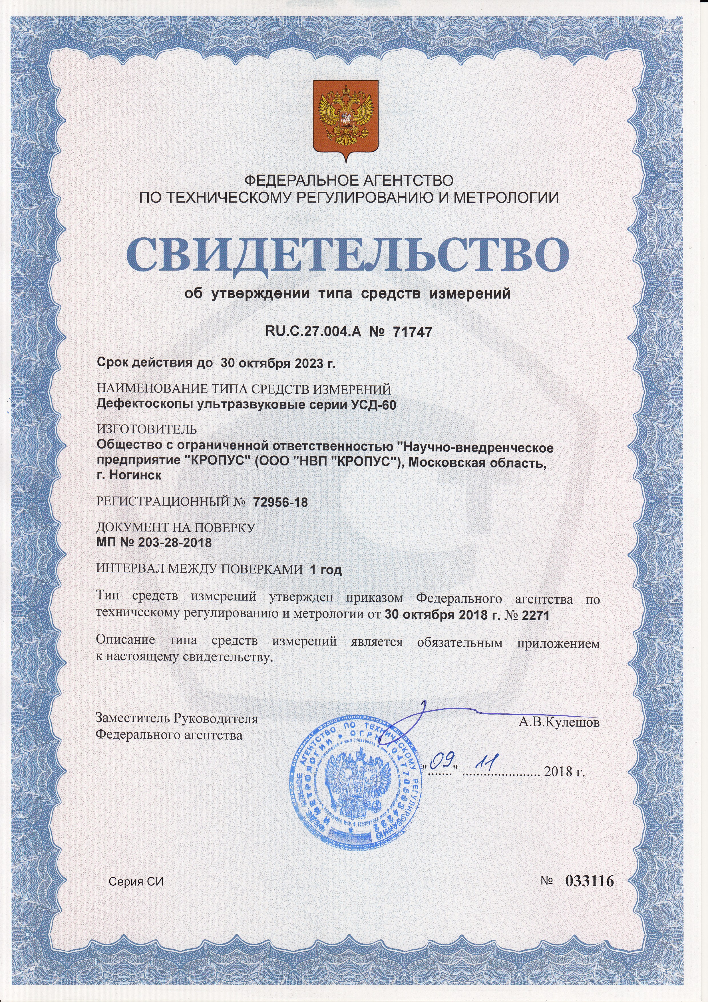 Сертификаты на низкочастотный дефектоскоп УСД-60Н: