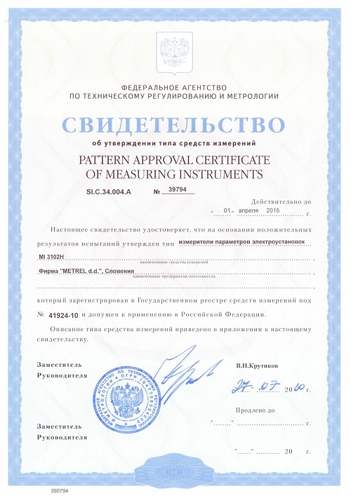 Сертификаты на измеритель параметров электроустановок Metrel MI 3102H: