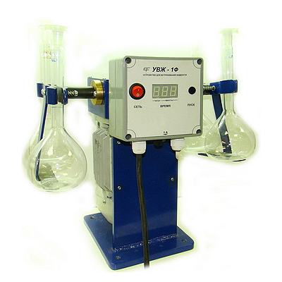 Устройство для встряхивания жидкостей в сосудах УВЖ-1Ф предназначено для испытания битумной эмульсии на устойчивость при транспортировании, в соответствии с ГОСТ Р 52128-2003. Сущность метода заключается в оценке способности эмульсии не распадаться на воду и вяжущее после испытания ее встряхиванием в приборе в течение 2 ч. По истечении этого времени прибор автоматически прекращает работу. Во время работы на индикаторе отображается время, оставшееся до конца испытания.