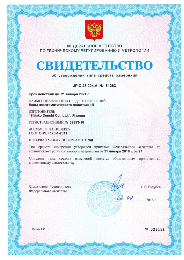 | Свидетельство о первичной метрологической поверке весов в комплекте | |