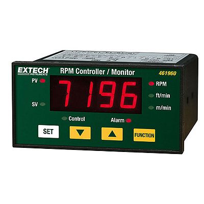 Контроллер оборотов вращения/монитор Extech 461960 - встроенный контроллер и сигнальное реле с устанавливаемым высоким/низким пределом. Разрешение 0.1об./мин., 0.1фут/мин., 0.01м/мин. Точность +(0.1%+1цифра). Питание 90-260В переменного тока, 50/60Гц.