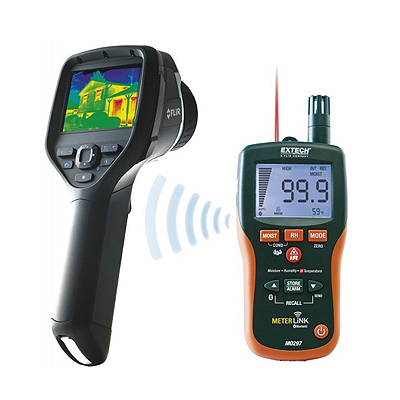Бесштифтовой психрометр/ измеритель влагосодержания с инфракрасным термометром Extech MO297 прибор с передатчиком Bluetooth и MeterLink. С Функцией беспроводной передачи данных о влажности на инфракрасную камеру FLIR с высокой степенью разрешения для объединения показаний прибора и теплового изображения. Функция одновременного отображения содержания влаги в исследуемых материалах, температуры воздуха, ИК температуры или влажности воздуха. Встроенный зонд.