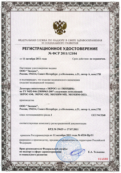 Дозаторы внесены в государственный реестр средств измерений под № 35528-07 и имеют медицинское Регистрационное Удостоверение № ФСР 2007/00097. Все дозаторы проходят обязательную первичную поверку (В комплект каждого дозатора входит индивидуальное свидетельство о поверке) и сопровождаются гарантийным и послегарантийным обслуживанием.