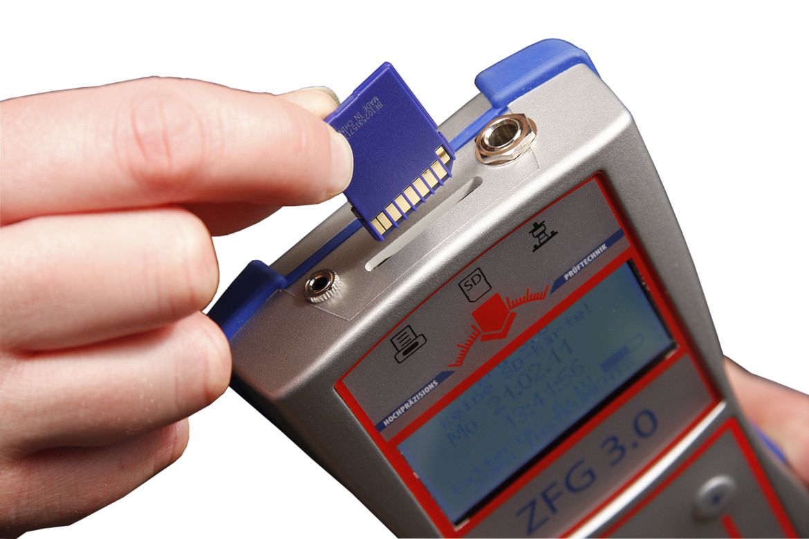 Электронный блок обработки измерений ZFG-3.0 представляет собой легкий компактный модуль, помещающийся в одной руке. На передней панели прибора расположен ЖК дисплей, на котором отображается вся необходимая информация, а также кнопки управления прибором. Корпус блока имеет резиновую окантовку, защищающую прибор от повреждений при возможном падении. В верхней части блока расположены разъемы для подключения к принтеру и к нагрузочной плите. Там же расположено гнездо для карты памяти. Также при формировании заявки на ZFG-3.0 пользователь может заказать установку внутреннего модуля спутниковой навигации GPS, который позволит привязывать место проведения замера к географическим координатам. Установка модуля GPS может быть произведена только на заводе-изготовителе, поэтому данная опция должна быть оговорена на этапе формирования заявки на прибор и не может быть заказана отдельно.