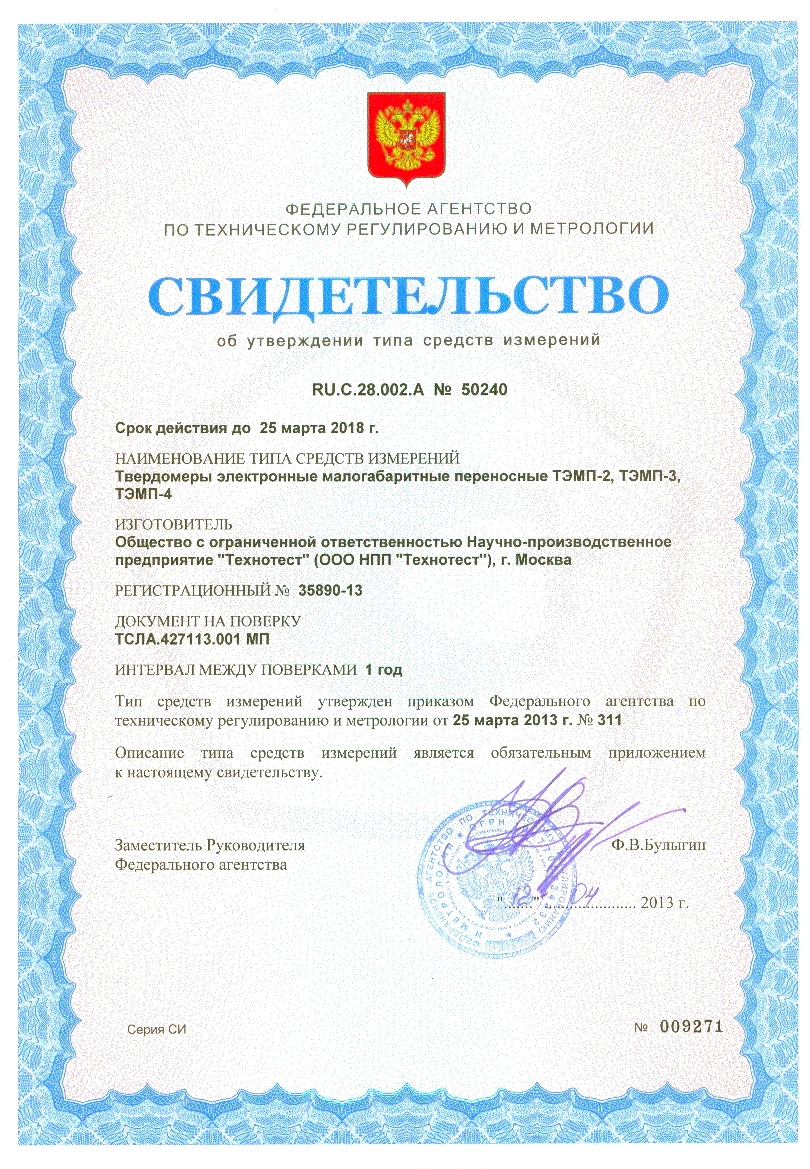 Твердомер прошел Госиспытания (свидетельство RU.C.28.002.A № 50240), зарегистрирован в Государственном Реестре средств измерений ГОССТАНДАРТа России под № 35890-13 и допущен к применению в Российской Федерации. В дополнение к этому, прибор ТЭМП-2 зарегистрирован в Государственных Реестрах средств измерений ГОССТАНДАРТов Беларуси, Украины, Казахстана и в отраслевом Реестре средств измерений ОАО РЖД под № МТ 008.2014.