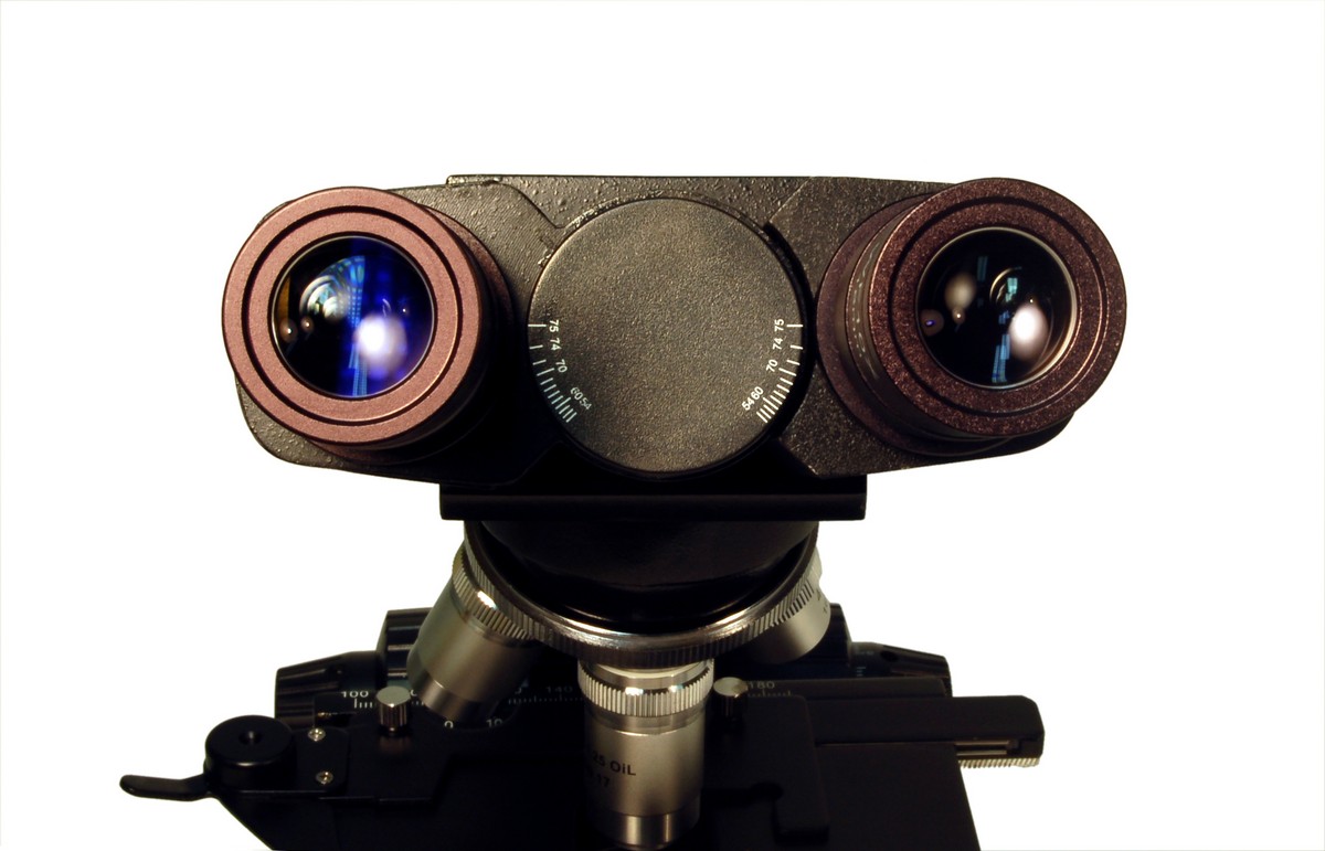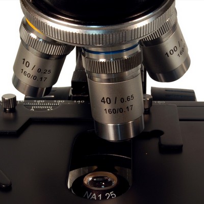 Микроскоп оснащен револьверной головкой на 4 объектива, которая позволяет быстро изменять используемое увеличение непосредственно в процессе работы. Бинокулярная насадка с возможностью регулировки межзрачкового расстояние обеспечивает максимальный комфорт при наблюдениях, благодаря ей нагрузка распределяется равномерно на оба глаза и они меньше устают даже при длительной работе. Окуляры наклонены к вертикали на угол 30°, что обеспечивает максимально удобное положение головы при работе с микроскопом. Микроскоп комплектуется двумя парами окуляров, что позволяет расширить диапазон используемых увеличений. В базовой комплектации можно получить увеличения от 40х до 2000х. При работе на высоких увеличениях используется иммерсионный метод наблюдения — это значит, что между объективом микроскопа и микропрепаратом вводится капля специальной жидкости, что улучшает качество изображения и позволяет получить более высокие увеличения. Микроскоп комплектуется флаконом иммерсионной жидкости.