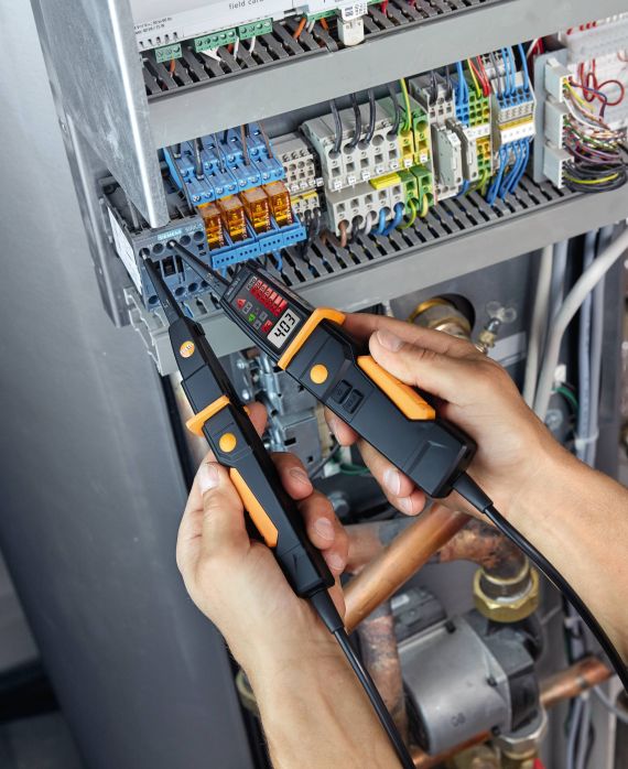 Тестер напряжения testo 750-3 прежде всего подходит для проверки наличия или отсутствия напряжения в электрической сети. Помимо этого, он также может использоваться для теста целостности цепи, определения направления вращающихся магнитных полей и тестирования устройств защитного отключения. Благодаря вибрации при нажатии на кнопки запуска тест отключения не может быть проведен случайно.